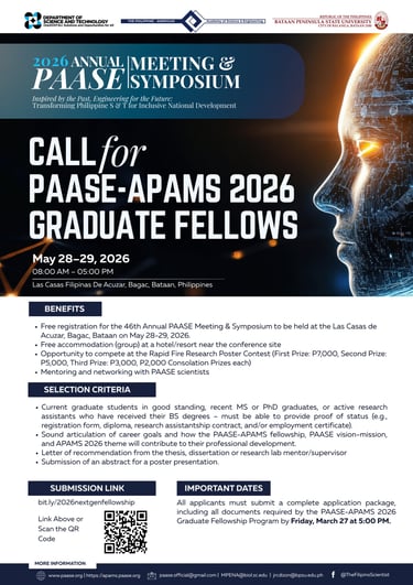 The Philippine-American Academy of Science and Engineering (PAASE) is now accepting applications for the PAASE–APAMS 2026 Graduate Fellowship Program, to be held as part of the 2026 Annual PAASE Meeting & Symposium organized by PAASE, the Department of Science and Technology (DOST), and Bataan Peninsula State University (BPSU), on 28–29 May 2026 at Las Casas Filipinas de Acuzar, Bagac, Bataan.
