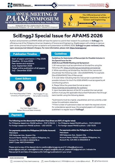 Authors and presenters at APAMS 2026 will have the option to submit their research for publication in SciEnggJ, the official journal of the Philippine-American Academy of Science and Engineering. Eligible papers will undergo a rigorous peer-review process following their acceptance and presentation at APAMS 2026. SciEnggJ is a peer-reviewed, online, open-access journal indexed in Scopus. For more information, please visit: https://scienggj.org/