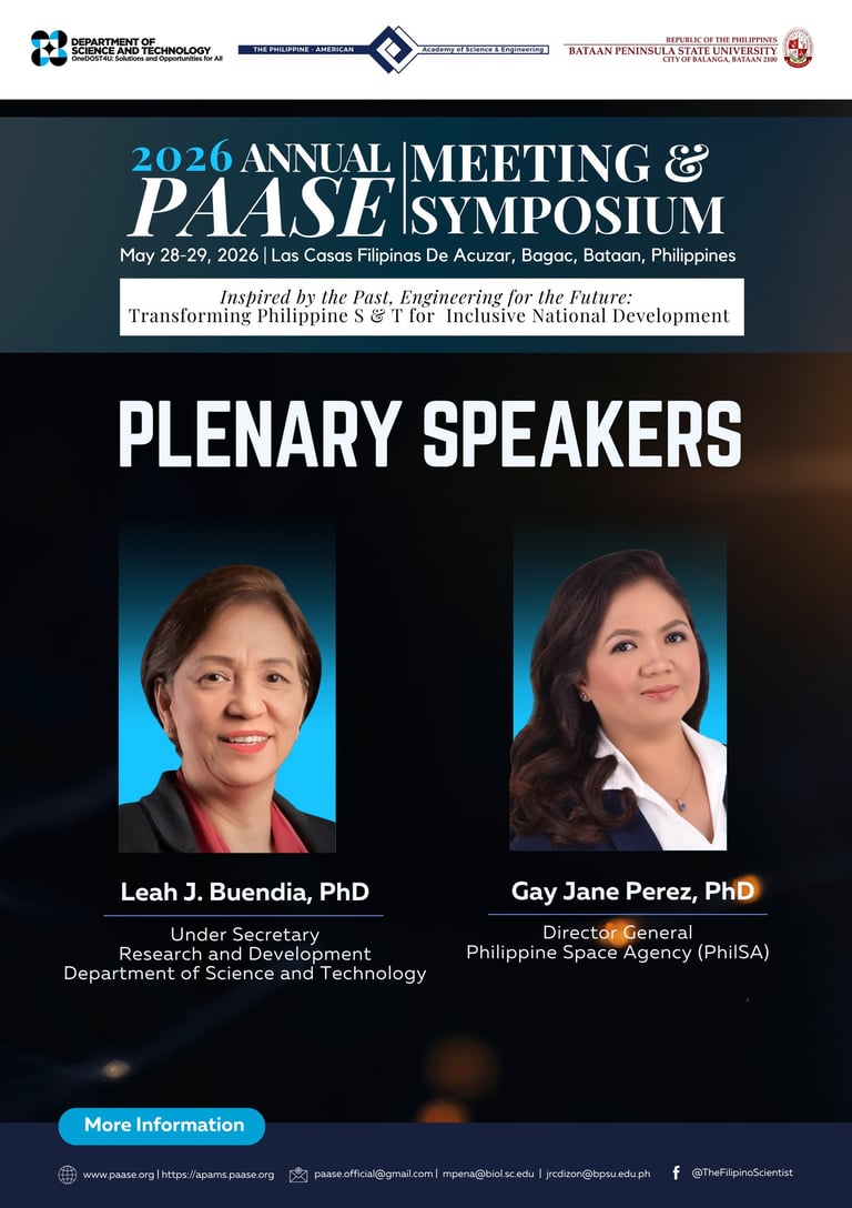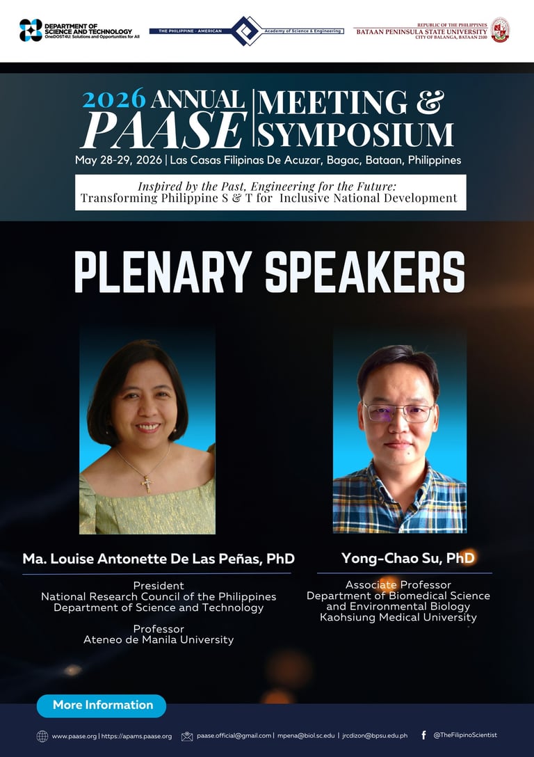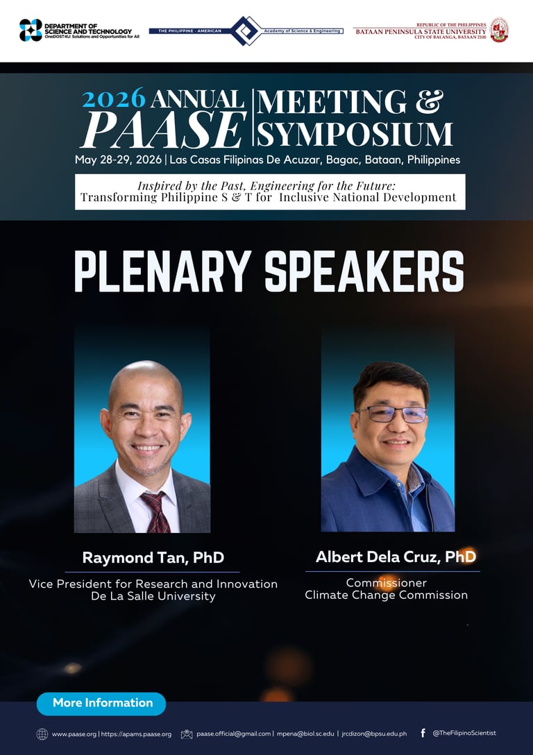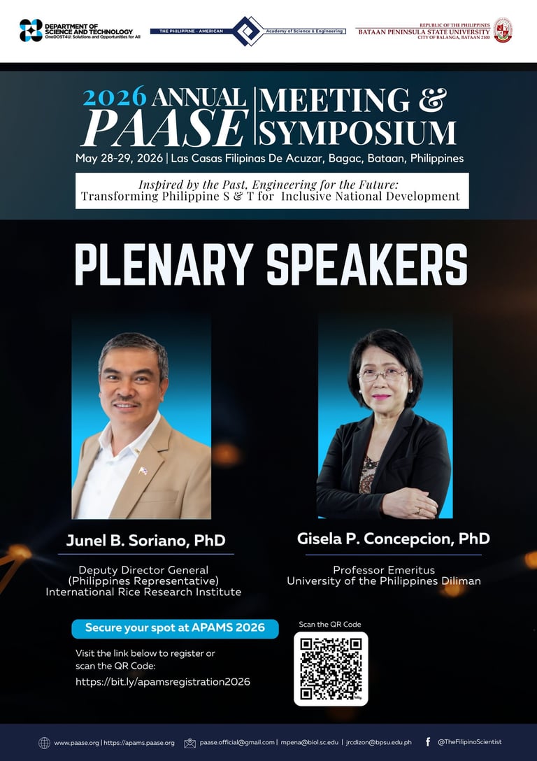 The Philippine-American Academy of Science and Engineering (PAASE), in partnership with the Department of Science and Technology (DOST) and Bataan Peninsula State University (BPSU), is honored to introduce two more Confirmed Plenary Speakers for the 2026 Annual PAASE Meeting and Symposium (APAMS):